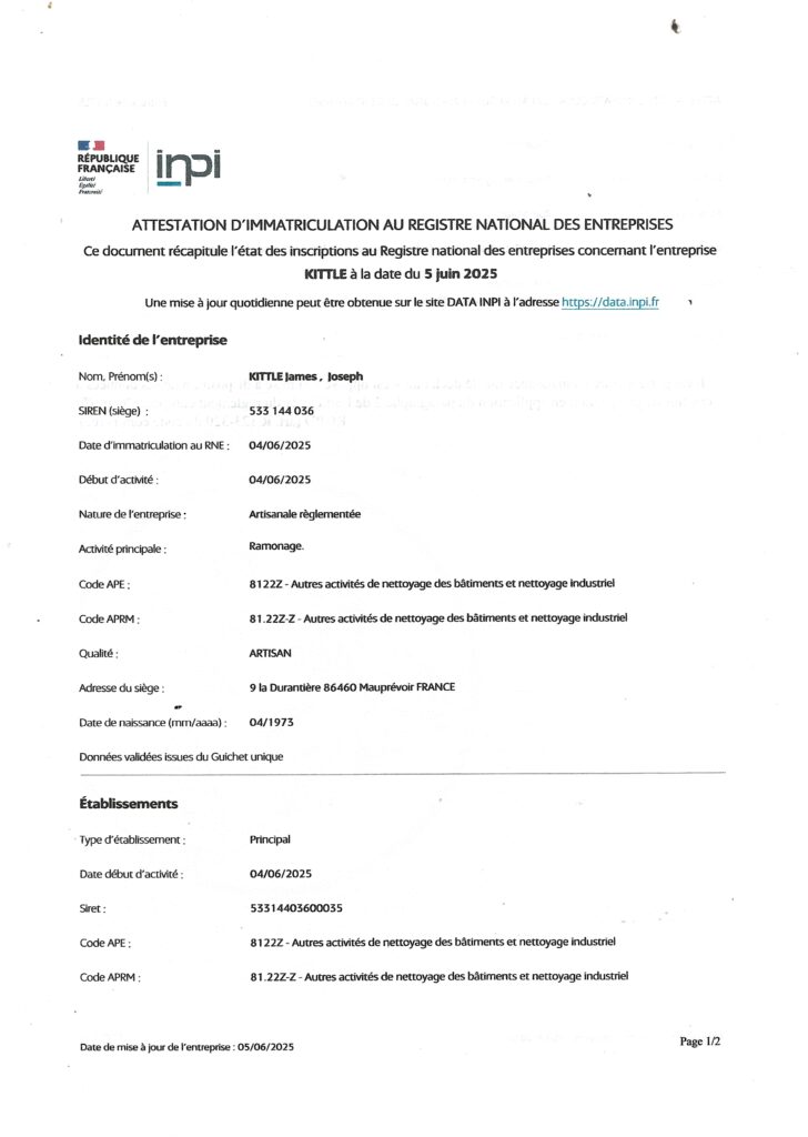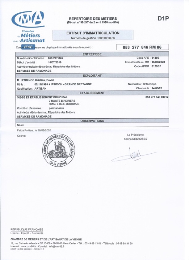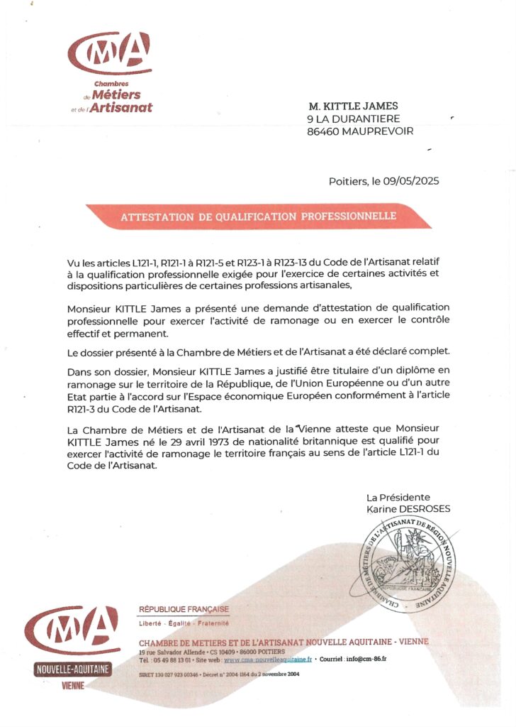Jennings Chimney Sweeping s’engage à poursuivre son développement professionnel et à consolider son expertise dans notre domaine. Voici la preuve de tous les cours que nous avons suivis, des reconnaissances reçues ainsi que de nos documents d’inscription auprès de la Chambre de Metiers et de l’Artisnat.